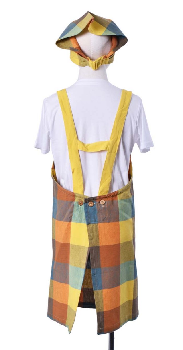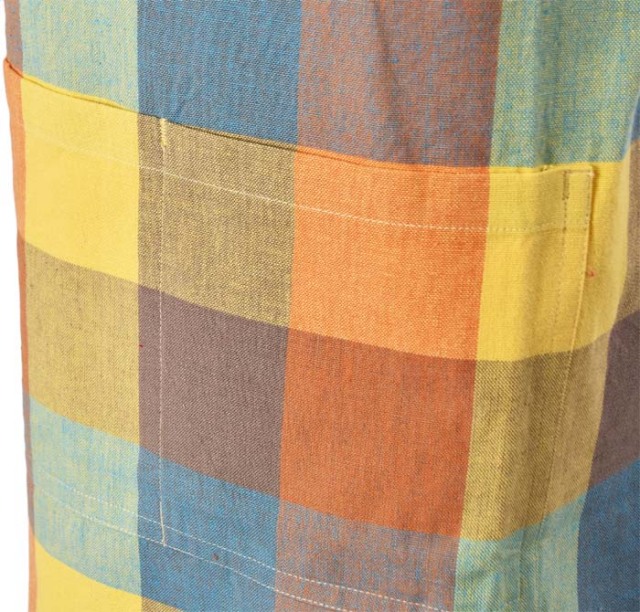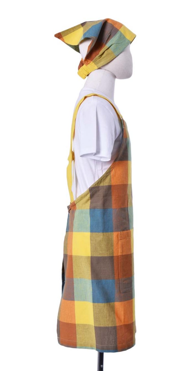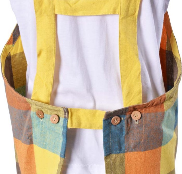 | 特長 | ビビットでマルチカラーのチェック柄のLサイズキッズエプロンです。同じ素材でお揃いのママ用ショートエプロンもあります。 |