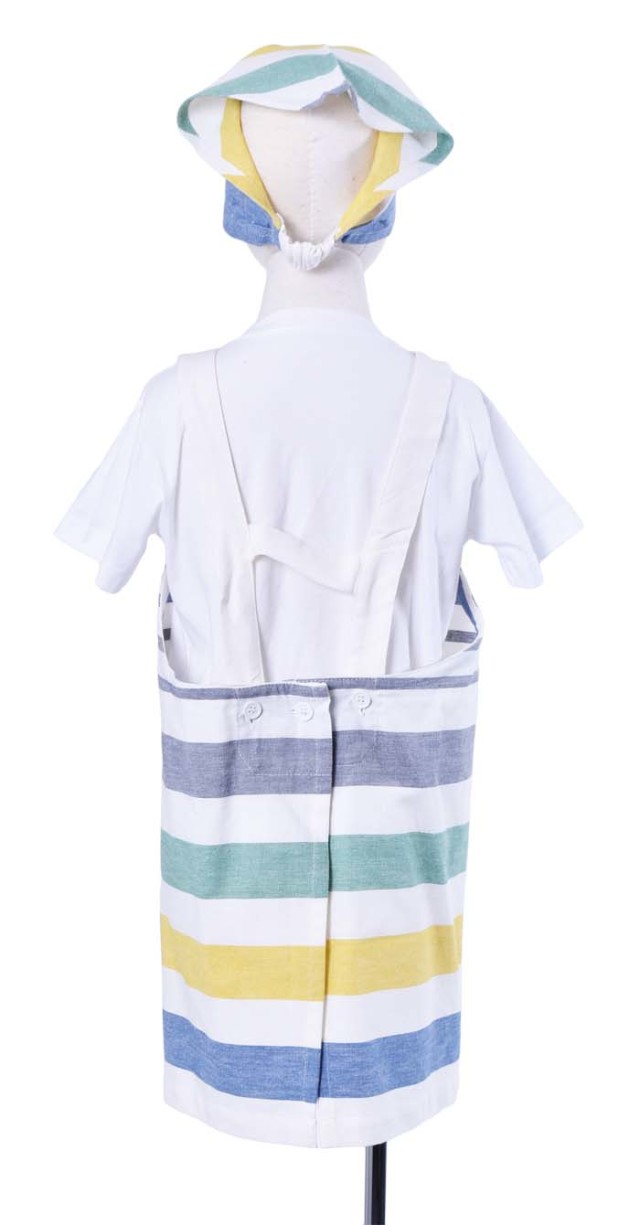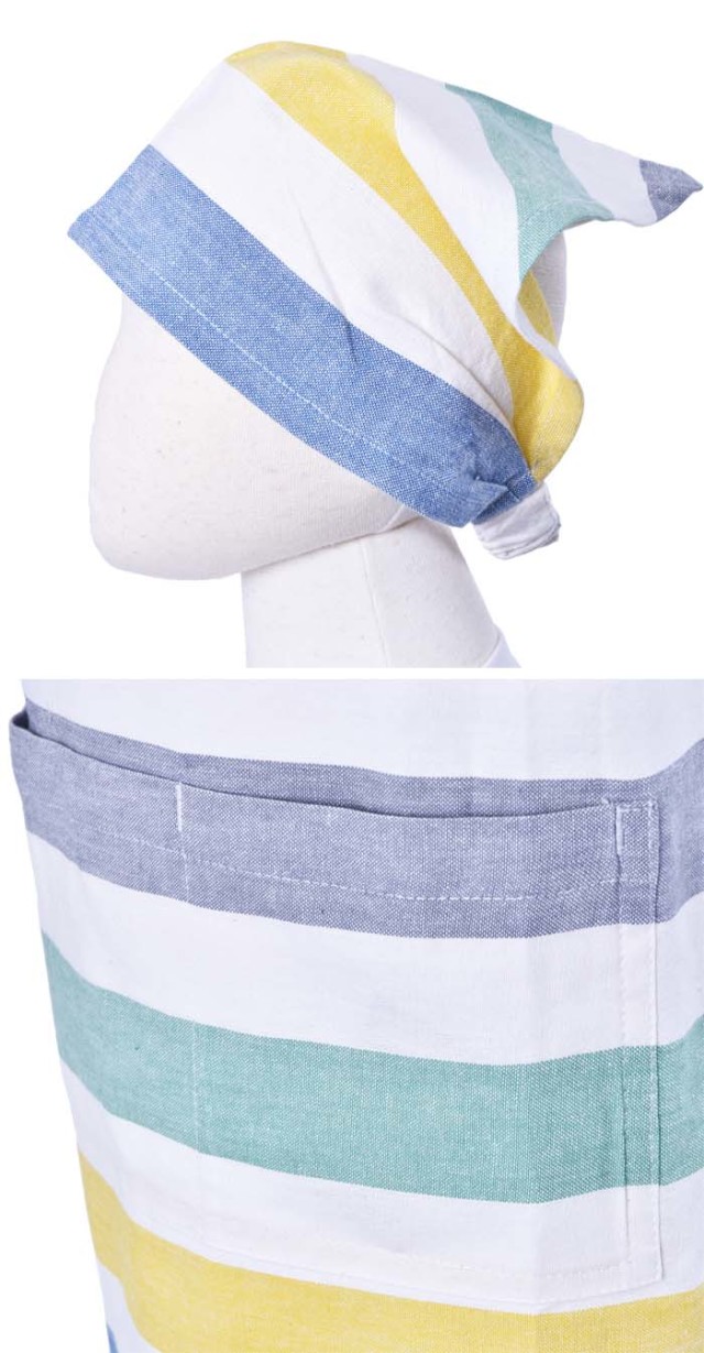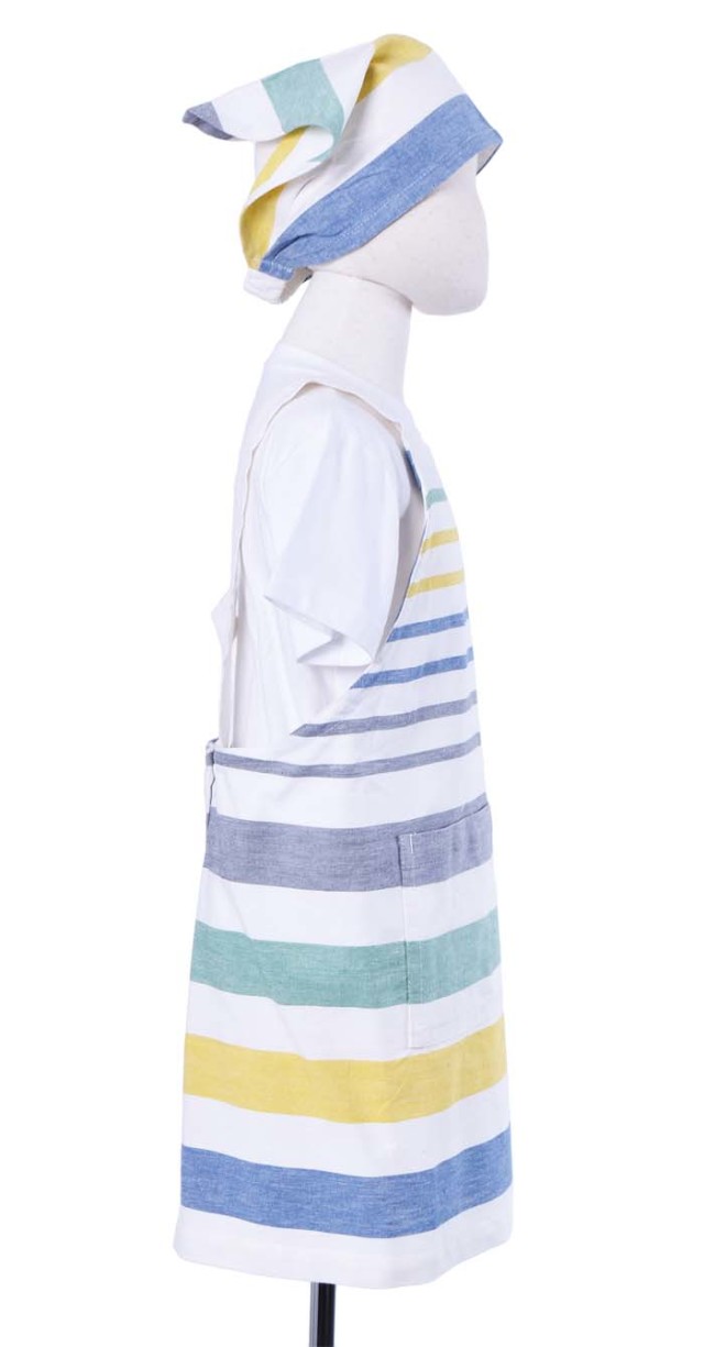 | 特長 | カラフルで楽しいボーダー柄のキッズエプロンで、ナチュラルなアイボリーがベースカラーなのでさらりと軽い感じの素材です。同じ素材でお揃いのママ用ショートエプロンもあります。 |